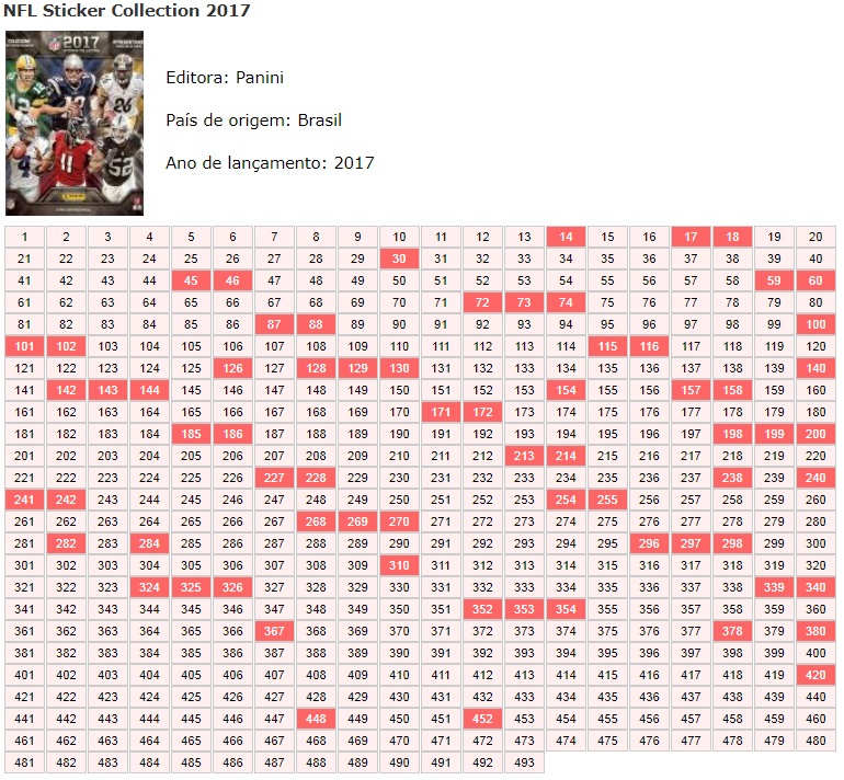 | 77734 | Brasil, 2017, figurinhas do álbum " NFL Sticker Collection", Editora Panini a escolher (preço unitário) - OBS. Figurinhas especiais (holográficas, metalizadas, plásticas, de tecido, texturizadas) quando houver são R$1 | 0,40 | Foto |