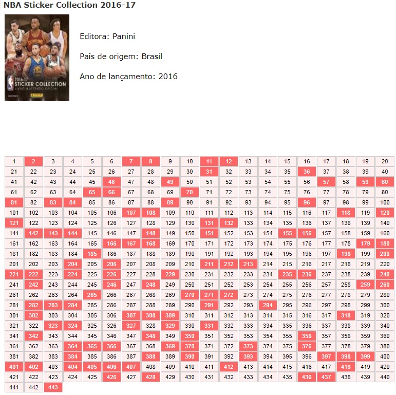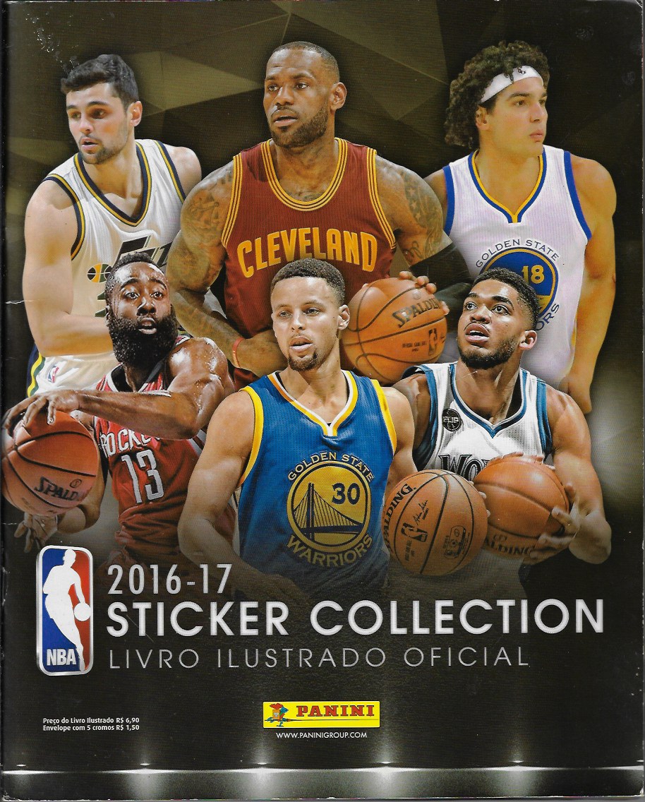 | 83490 | Brasil, 2016, álbum de figurinhas "NBA Sticker Collection 2016-17", Editora Panini, completo com 443 figurinhas coladas, sendo 78 especiais | 107,00 | Foto |