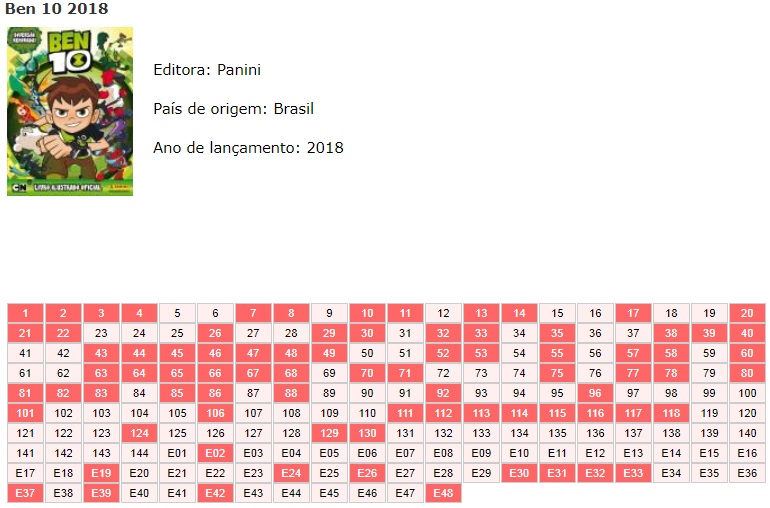 | 78587 | Brasil, 2018, figurinhas do álbum "Ben 10", Editora Panini, a escolher (preço unitário) - OBS. Figurinhas especiais (holográficas, metalizadas, plásticas, de tecido, texturizadas) quando houver são R$1 | 0,40 | Foto |