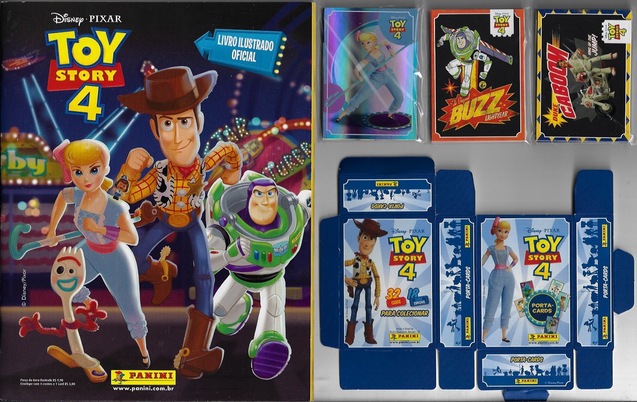 | 83516 | Brasil, 2019, álbum de figurinhas "Toy Story 4", Editora Panini, completo com 212 figurinhas coladas, sendo 36 metalizadas, e 50 cards junto com a caixa para guardar os cards | 72,00 | Foto |