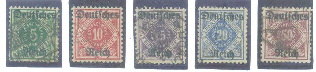 | 54956 | Reich, Mi-Oficial-52/56, Selos de Württemberg sobrestampados, alguns picotes irregulares, carimbados (60 €) | 47,00 | Foto |