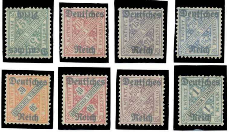 | 54957 | Reich, Mi-Oficial-57/64, Selos de Württemberg sobrestampados, alguns picotes irregulares, N (50 €) | 39,00 | Foto |