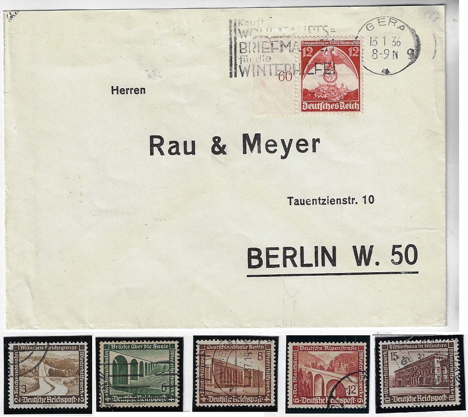 | 55401 | Reich, Mi-634, 637/640, Ajuda de Inverno - Edificações, carimbados (22,4 €) e envelope de 1936 com flâmula "Kauft Wohlfahrts-Briefmarken für die Winterhilfe (Compre selos de bem-estar para ajuda de inverno)" | 27,00 | Foto |