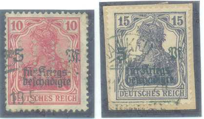 | 55856 | Reich, Mi-105 e 106, Germânia Sobrestampada "Assistência aos deficientes da Guerra", Mi-105 com perfin e papel colado no verso, Mi-106 sobre micro-fragmento, carimbados (28 €) | 21,00 | Foto |