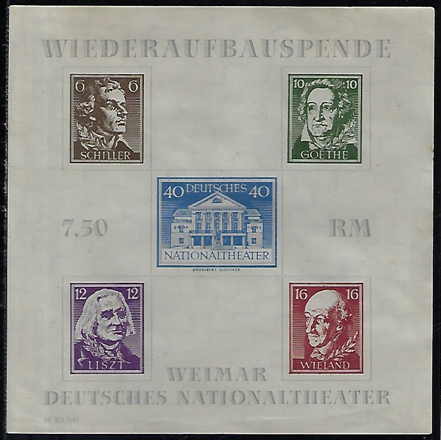 | 63403 | Zona Soviética da Turíngia, 1946, Michel Bloco 3A, Reconstrução do Teatro Nacional em Weimar, Schiller, Goethe, Liszt e Wieland, novo sem goma | 100,00 | Foto |