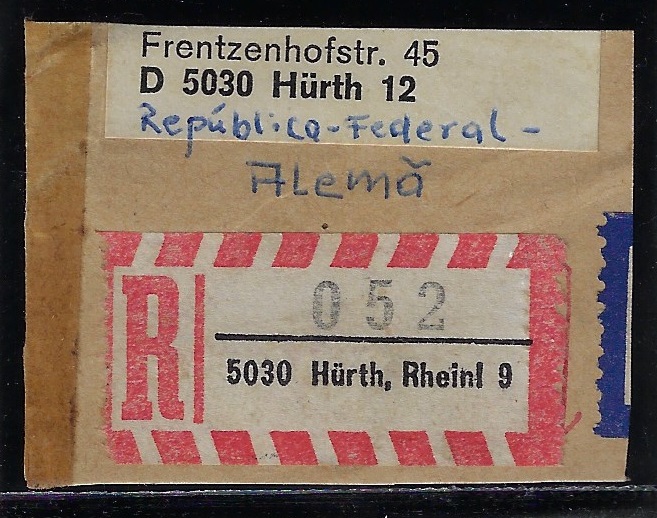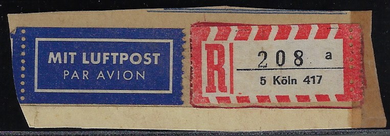 | 69788 | Ocidental, etiqueta de registro da cidade de 5 Köln 417 + etiqueta de Correio Aéreo | 10,00 | Foto |