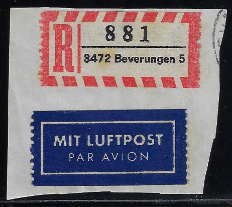 | 80151 | Ocidental, etiqueta de registro da cidade de 3472 Beverungen 5 + etiqueta de Correio Aéreo | 10,00 | Foto |