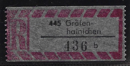 | 80324 | Oriental, etiqueta de registro da cidade de 445 Gräfenhainichen (em 2 linhas) | 10,00 | Foto |