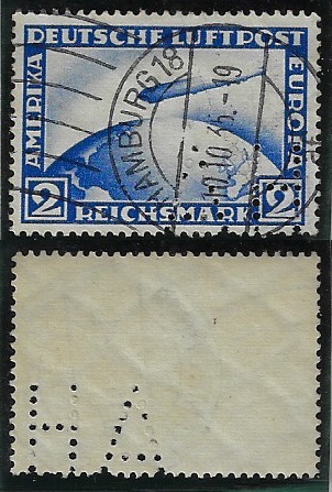 | 80415 | 1935, Correio Aéreo Zeppelin, 2 DM, carimbo Hamburg, com perfin | 90,00 | Foto |