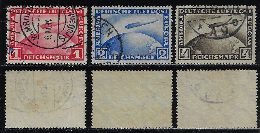 | 80419 | 1928, Correio Aéreo Zeppelin, série completa 1, 2 e 4 DM, carimbada | 300,00 | Foto |