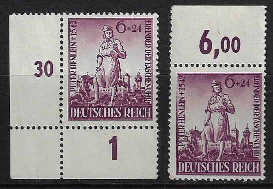 | 81676 | Reich, 1942, YT-743, Peter Henlein (1480-1542), inventor de relógios, monumento em Nurem, 6+24 Pfennig, margem da folha, numerada, sem uso, sem goma | 6,00 | Foto |