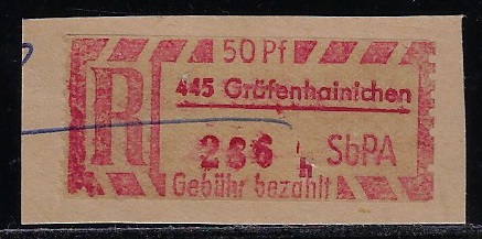 | 83665 | Oriental, etiqueta de registro da cidade de 445 Gräfenhainichen, em vermelho, Taxa Paga 50 Pfennig | 10,00 | Foto |