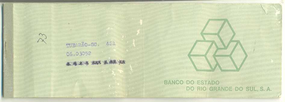 | 47388 | Brasil, 1973, talão de cheques, com capa e canhotos, porém nenhum cheque, do Banco do Estado do Rio Grande do Sul, leves roídos | 2,00 | Foto |