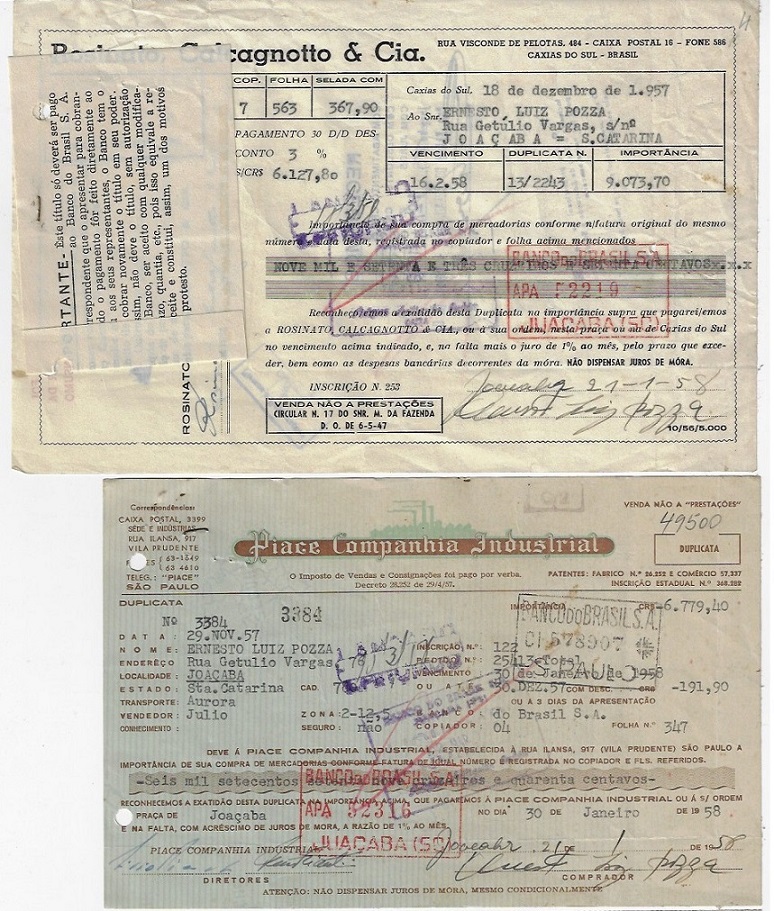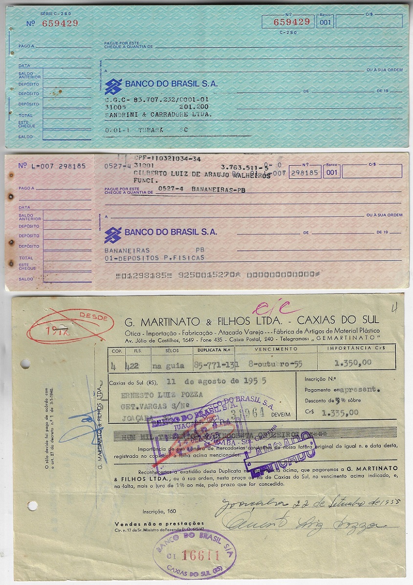 | 47395 | Brasil, 1970s, 2 cheques diferentes do Banco do Brasil, valores em Cr$, acompanha Duplicata de 1955 com carimbo do mesmo banco | 20,00 | Foto |