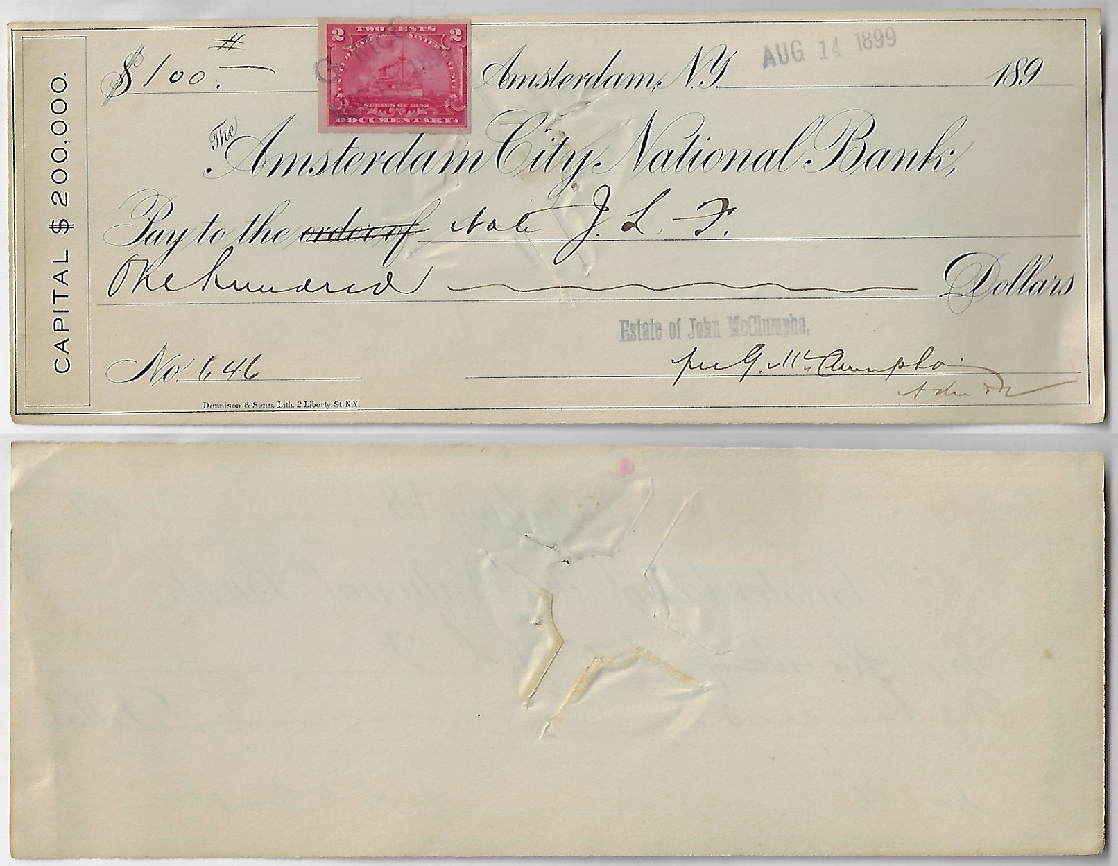 | 53214 | EUA, 1899, cheque do banco Amsterdam City National Bank, de Propriedade de John Mcclumpha, agência em Amsterdam, selo fiscal 2 Cents Documento | 20,00 | Foto |
