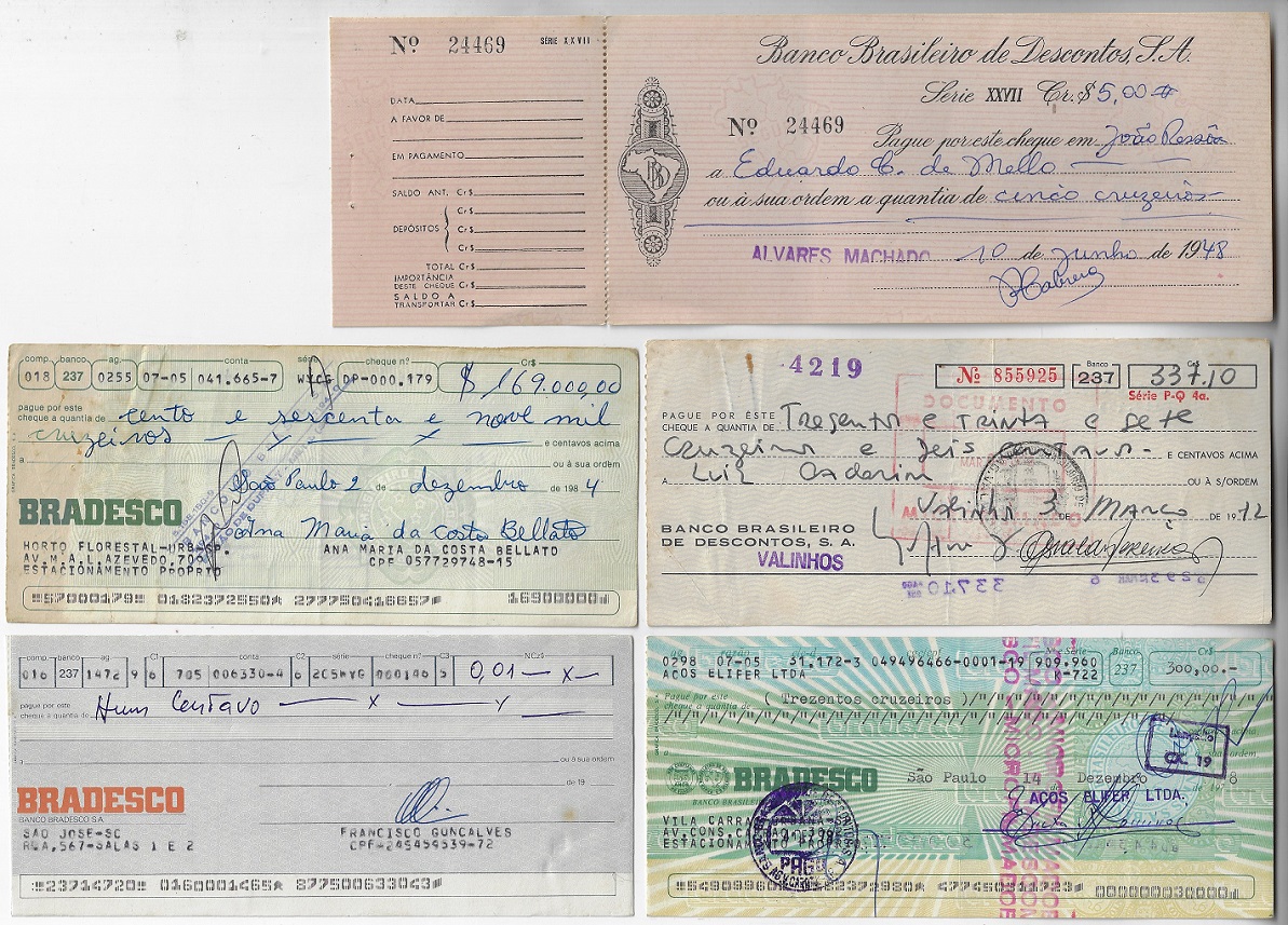 | 53816 | Brasil, 1948/1990, 5 cheques diferentes do Bradesco, valores em Cr$ e Ncz$, usados | 25,00 | Foto |