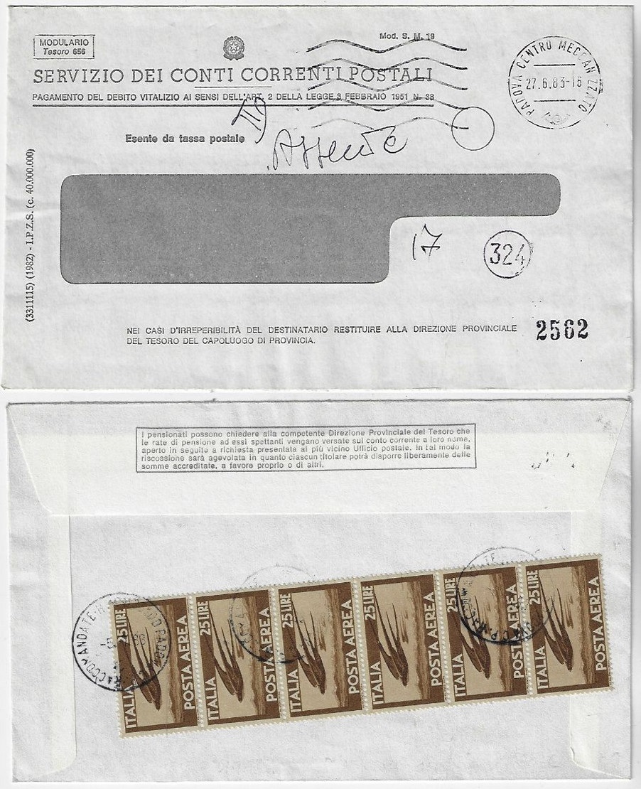 | 56230 | Itália, 1983, envelope timbrado e registrado do Serviço de Conta Corrente Postal, de Padova (27/6), com tira de 6 selos aéreos colados no verso | 20,00 | Foto |