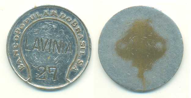 | 57792 | Brasil, 1960s, ficha metálica para atendimento no Banco Popular do Brasil, Agência Lavínia, Ø 35 mm | 40,00 | Foto |