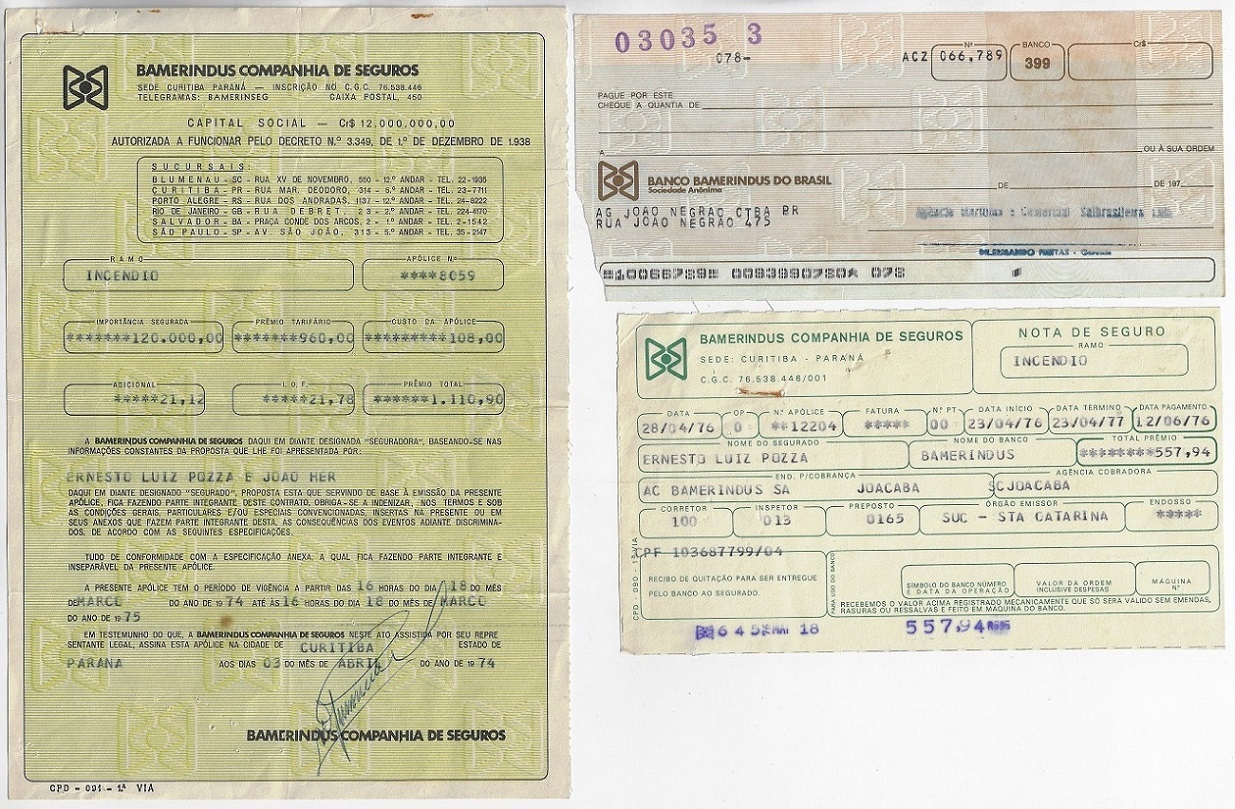 | 58839 | Brasil, 1970s, cheque do Banco Bamerindus do Brasil, valor em Cr$, sem uso porém com pequeno defeito + Apólice Seguro da Bamerindus Companhia de Seguros de 1974 | 20,00 | Foto |