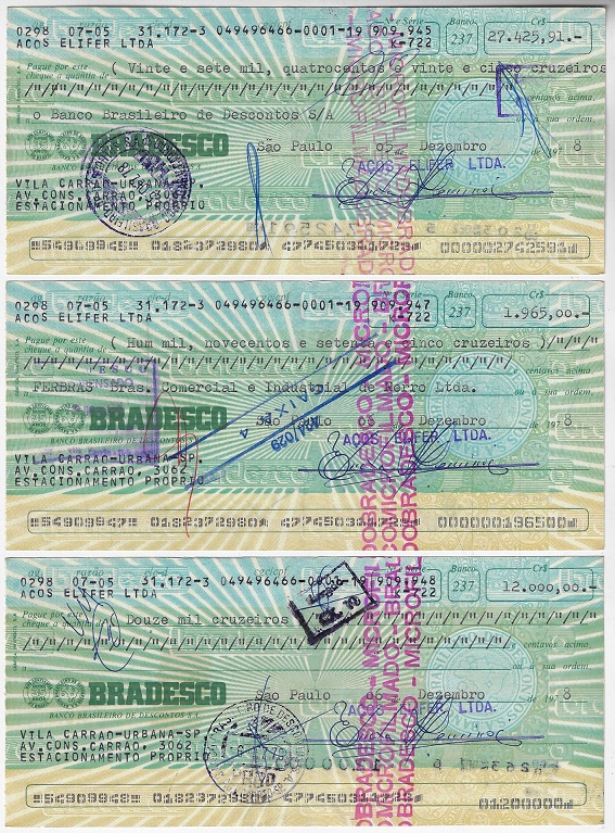 | 58848 | Brasil, 1978, 3 cheques do Banco Brasileiro de Descontos, valor em Cr$, compensados | 20,00 | Foto |