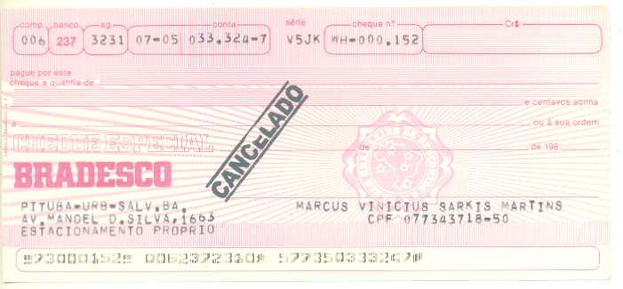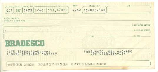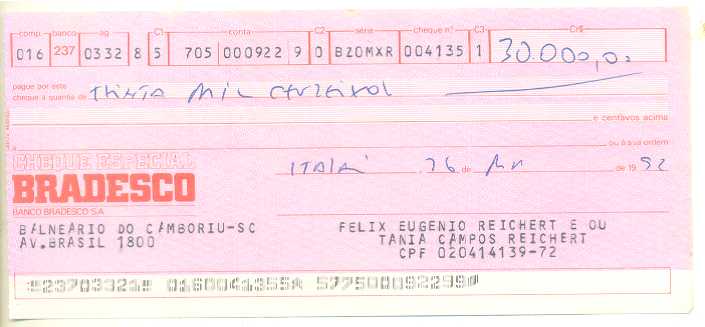 | 58854 | Brasil, 1992, cheque do Banco Brasileiro de Descontos, valor em Cr$, usado | 5,00 | Foto |