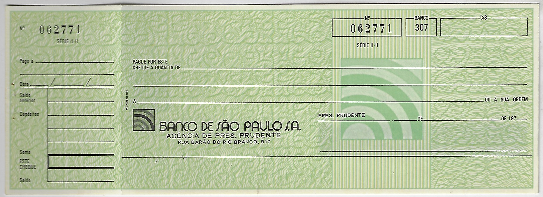| 58867 | Brasil, 1980s, cheques do Banco de São Paulo, agência de Presidente Prudente, valores em Cruzeiros, com canhoto | 5,00 | Foto |