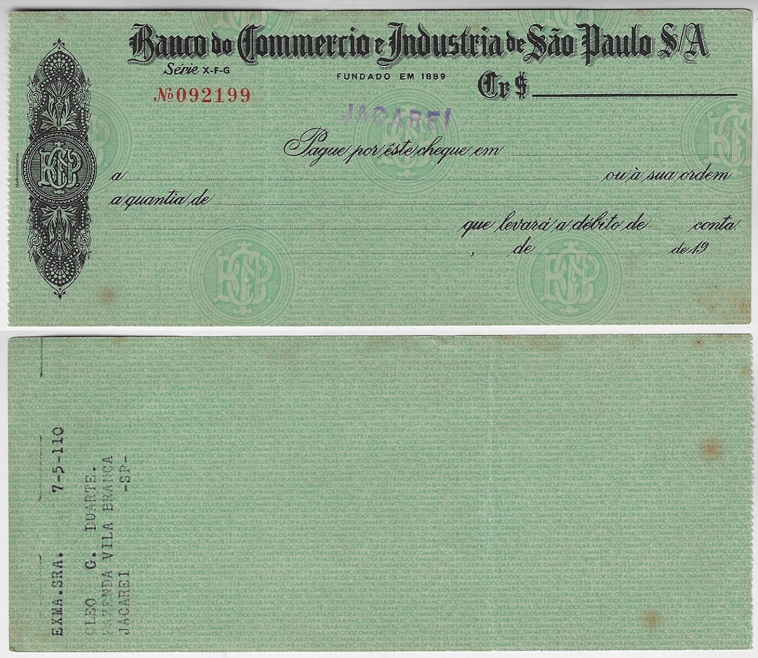 | 58872 | Brasil, 1950s, cheque do Banco do Comércio e Indústria de São Paulo SA, valor em Cr$, agência de Jacareí | 10,00 | Foto |