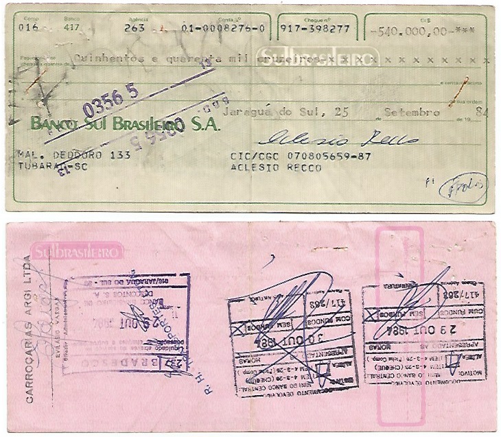 | 58919 | Brasil, 19??, cheque do Banco Sul Brasileiro, valor em Cr$, com canhoto, usado carimbos "Devolvido" | 5,00 | Foto |