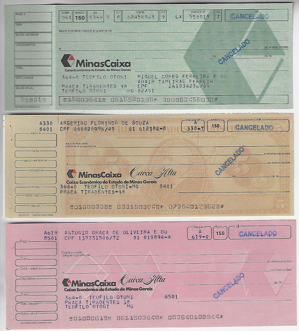 | 58926 | Brasil, 3 cheques diferentes da Caixa Econômica do Estado de Minas Gerais - Minas Caixa, valor em Cr$, com canhoto, sem uso | 15,00 | Foto |