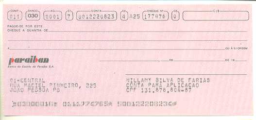| 58937 | Brasil, 1980s, cheque do Banco do Estado da Paraíba, valor em Cz$, sem uso | 5,00 | Foto |