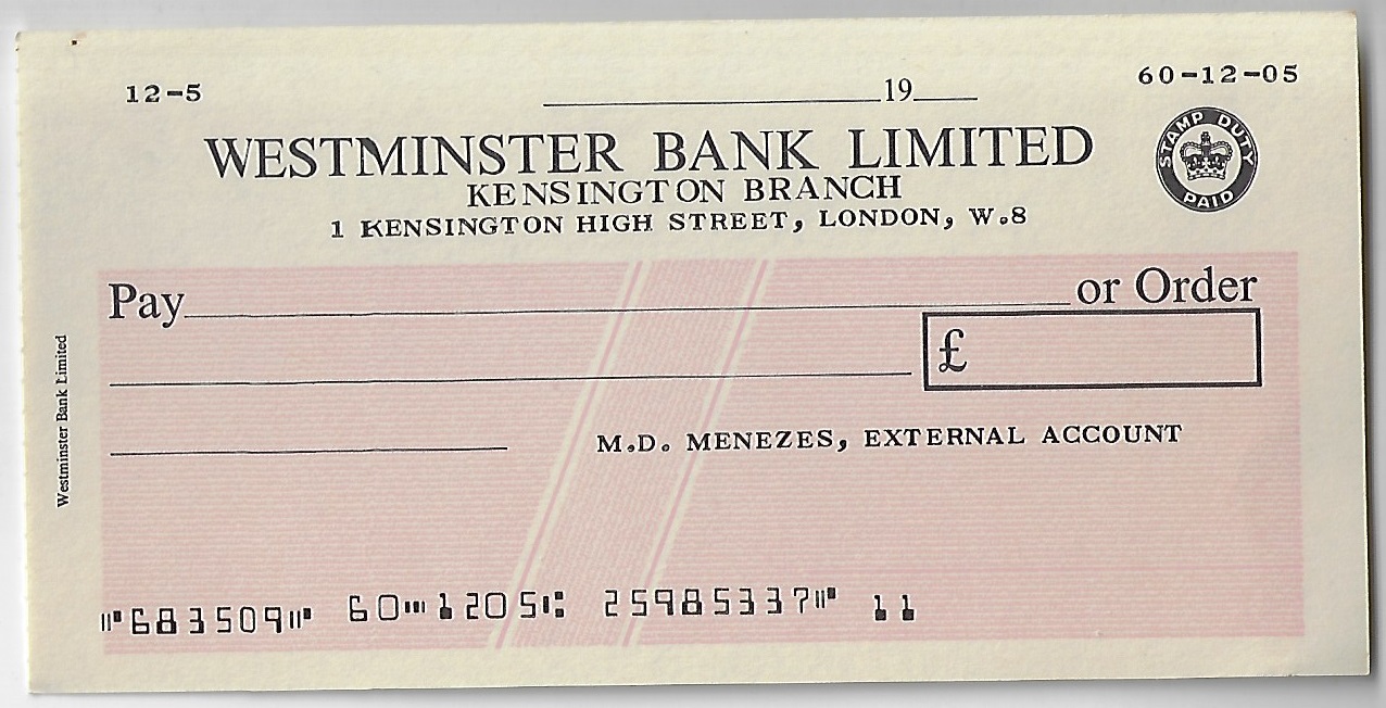 | 58944 | Grã-Bretanha, 1960s, cheque do Westminster Bank Limited, de Londres, selo fiscal impresso, sem uso | 10,00 | Foto |