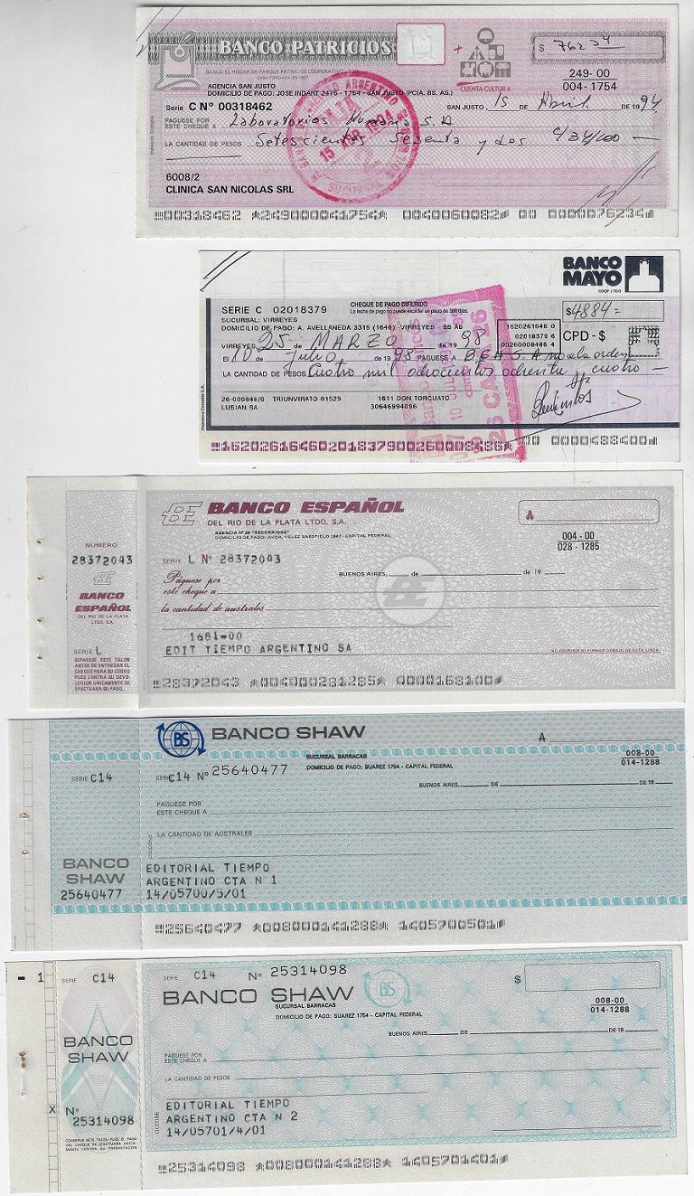 | 58951 | Argentina, 7 cheques diferentes do Banco Shaw, Español, Patricios, Popular Argentino e Mayo | 25,00 | Foto |