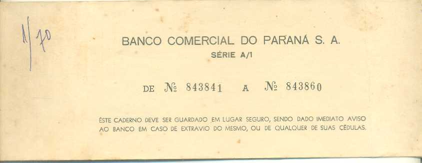 | 60027 | Brasil, 1970s, talão de cheques do Banco Comercial do Paraná, sem folhas | 5,00 | Foto |