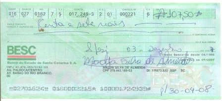 | 60357 | Brasil, 2007, cheque do BESC - Banco do Estado de Santa Catarina, usado | 5,00 | Foto |