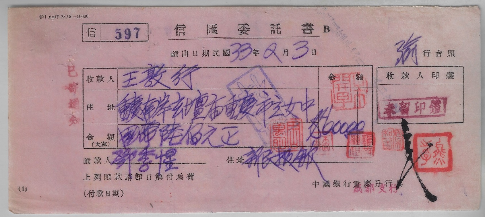 | 68885 | China, remessa de dinheiro feito pela Agência de Chongqing do Banco da China | 10,00 | Foto |