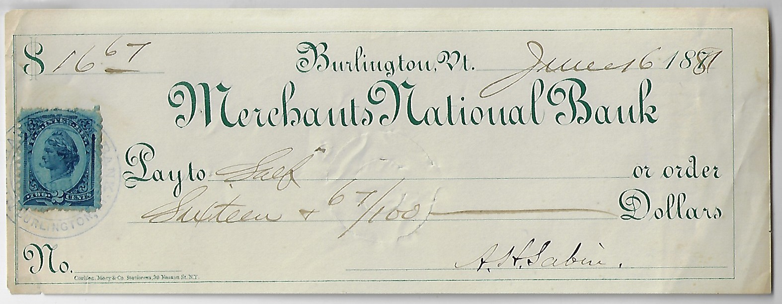 | 69547 | EUA, 1881, cheque do banco Merchants National Bank, agência em Burlington, selo fiscal 2 Cents Departamento de Receita Interna | 20,00 | Foto |