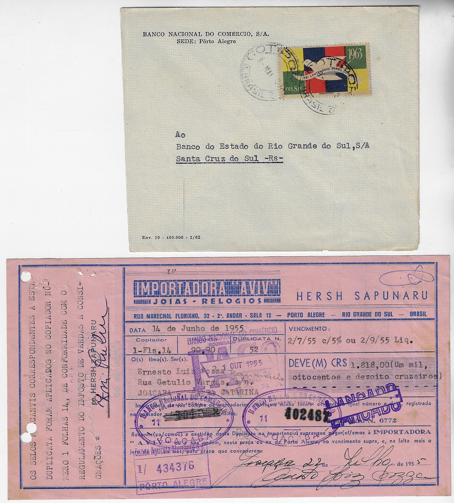 | 69590 | Brasil, 1963, envelope timbrado do Banco Nacional do Comércio, de Cotiporã / RS (8/5) para Santa Cruz do Sul / RS, enviado para o Banco do Estado do Rio Grande do Sul, porteado com selo comemorativo, acompanha duplicata do mesmo banco | 20,00 | Foto |