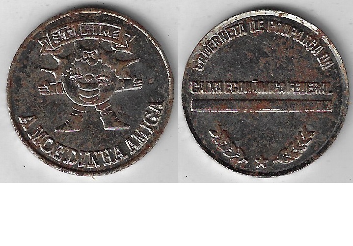 | 70523 | Brasil, 1980s, ficha Tilim a Moedinha Amiga, da Caixa Econômica Federal, Ø 30 mm, oxidada | 13,00 | Foto |