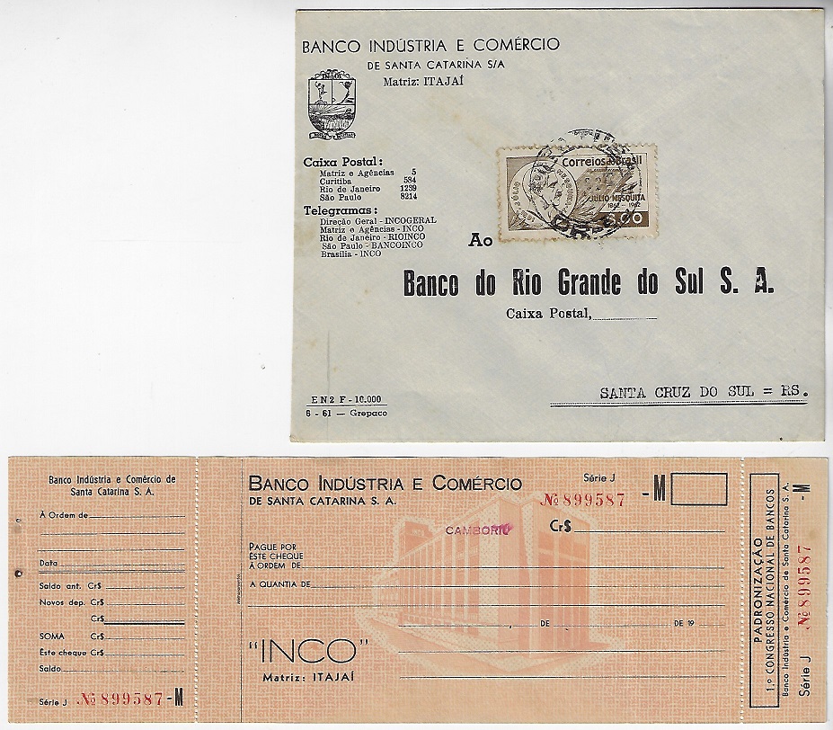 | 72879 | Brasil, 1962, envelope timbrado do Banco Indústria e Comércio - INCO para Banco do Rio Grande do Sul, porteado com selo comemorativo, e cheque com canhoto, ambos da matriz de Itajaí | 20,00 | Foto |
