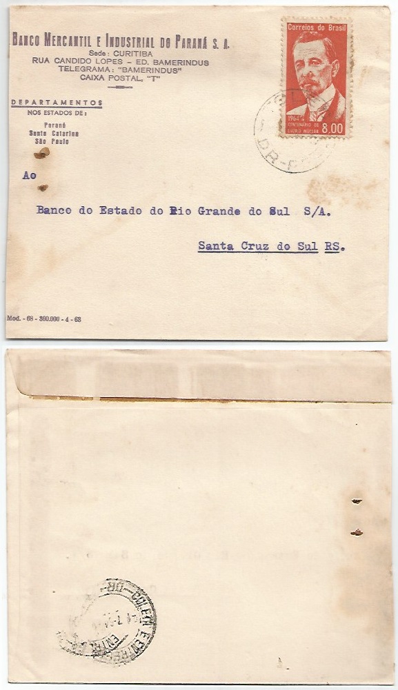| 74482 | Brasil, 1964, envelope timbrado do Banco Mercantil e Industrial do Paraná para o Banco do Estado do Rio Grande do Sul, selo comemorativo | 6,00 | Foto |