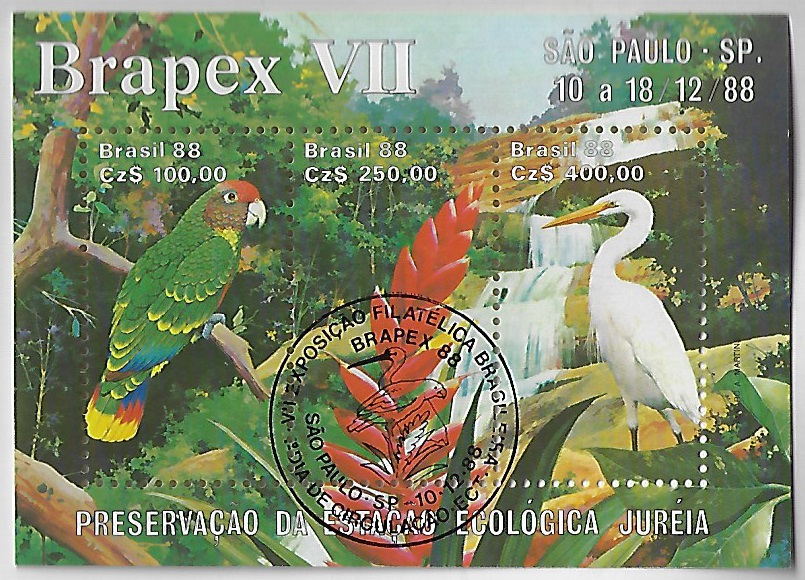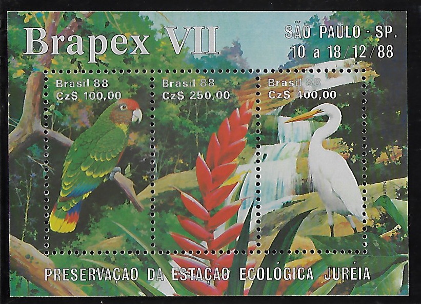 | 20106 | 78, Brapex 88 - Preservação da Estação Ecológica Juréia - Aves e Flores, mint, Garça, Papagaio, Cachoeira (7 UF) | 7,00 | Foto |