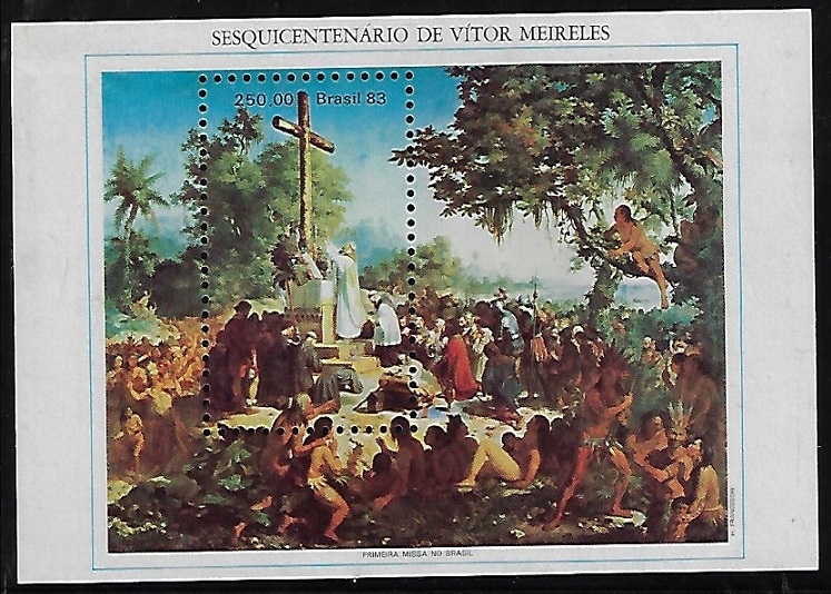 | 41950 | 63, Sesquicentenário do Nascimento do pintor Victor Meirelles de Lima, pintura "Primeira Missa no Brasil", sem uso com leves pontos amarelados (7 UF) | 7,00 | Foto |