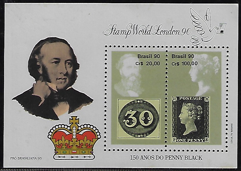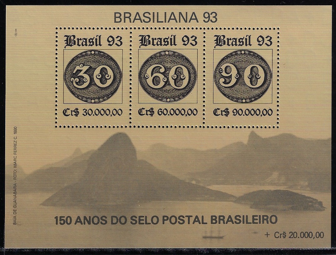 | 51415 | 95, Brasiliana 93 - 150 Anos do Selo Postal Brasileiro, posição da filigrana normal quando o bloco é visto de frente contra a luz, novo emitido sem goma (30 UF) | 30,00 | Foto |