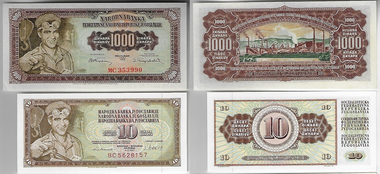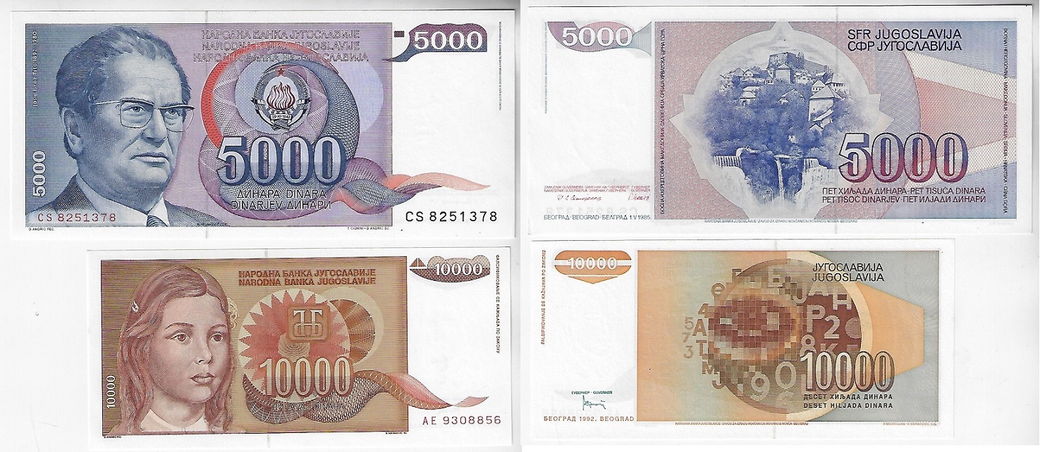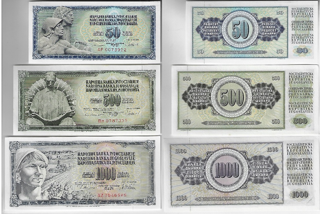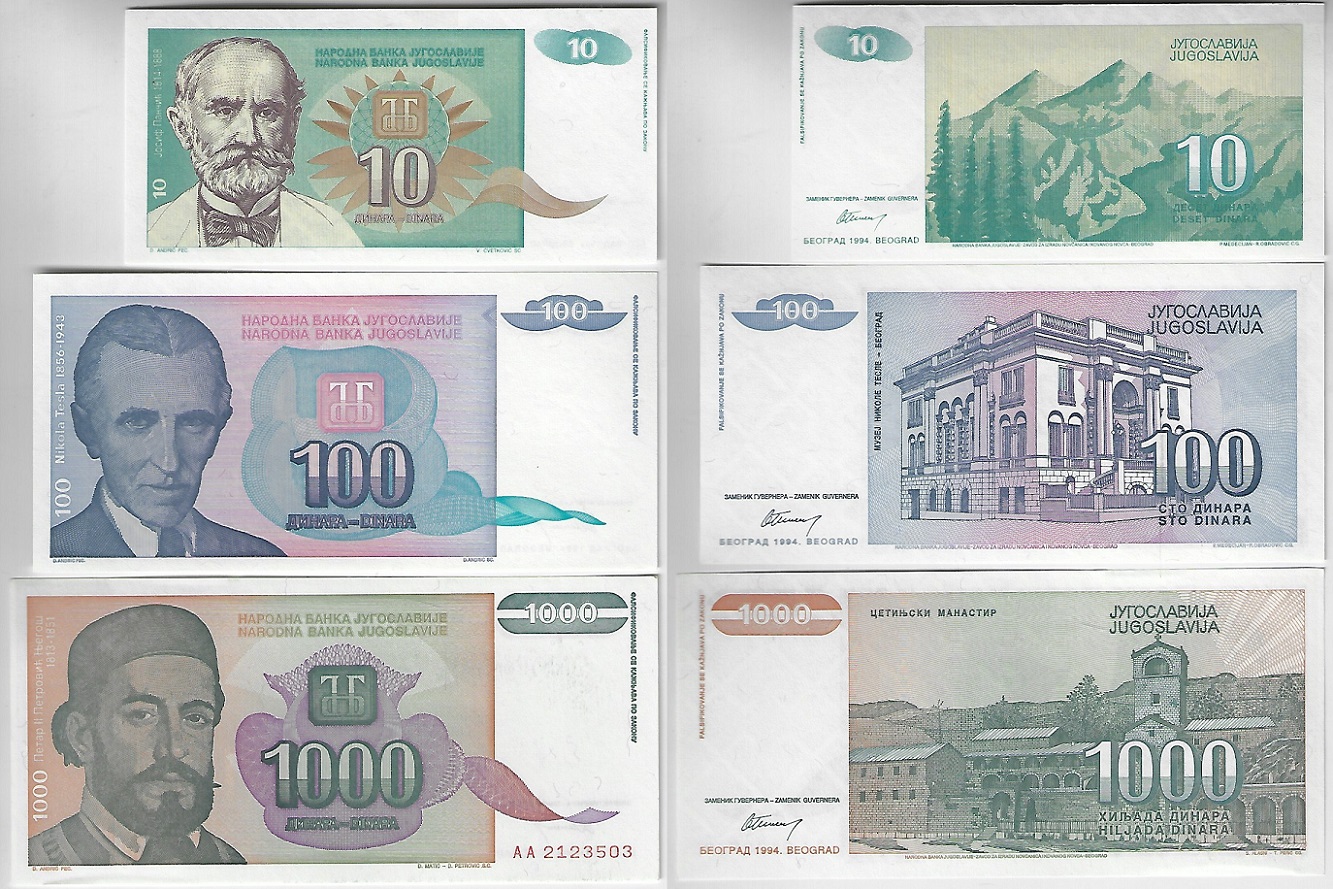 | 41314 | Iugoslávia, 10, 100 e 1.000 Dinares, 1994, Pick-138, 139 e 140, todas FE (catálogo US$4) | 16,00 | Foto |