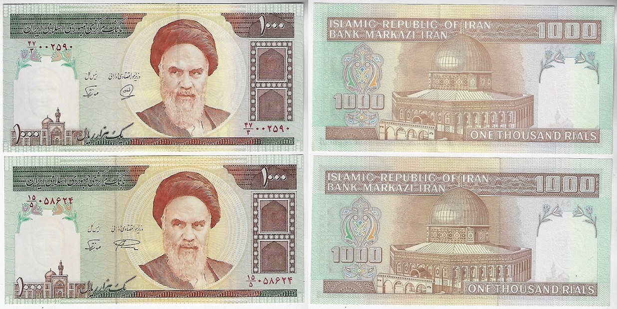 | 41358 | Irã, 1.000 Rials, 1992/..., Pick-143b e 143c, Aiatolá Khomeine, ambas FE (catálogo US$8) | 32,00 | Foto |
