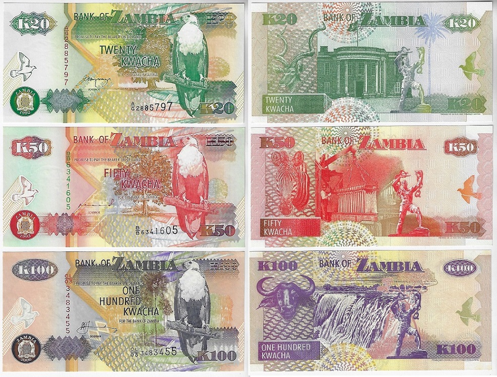 | 41775 | Zâmbia, 20, 50 e 100 Kwacha, 1992, Pick-36b, 37a e 38f, todas FE (catálogo US$8) | 32,00 | Foto |