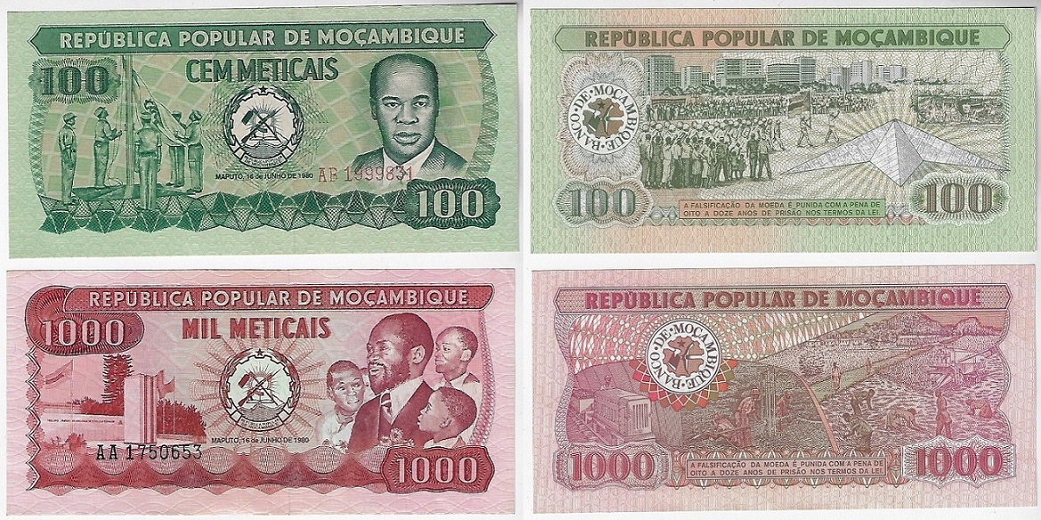 | 52285 | Moçambique, 100 e 1.000 Meticais, 1980, Pick-126 (FE) e Pick-128 (S) | 13,00 | Foto |