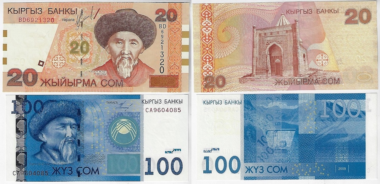 | 54672 | Quirguistão, 20 e 100 Som, 2002/2009, Pick-19 e 26, ambas FE (catálogo US$12,5) | 38,00 | Foto |