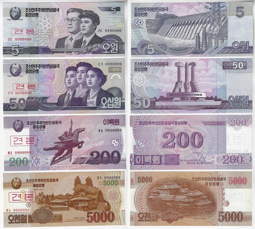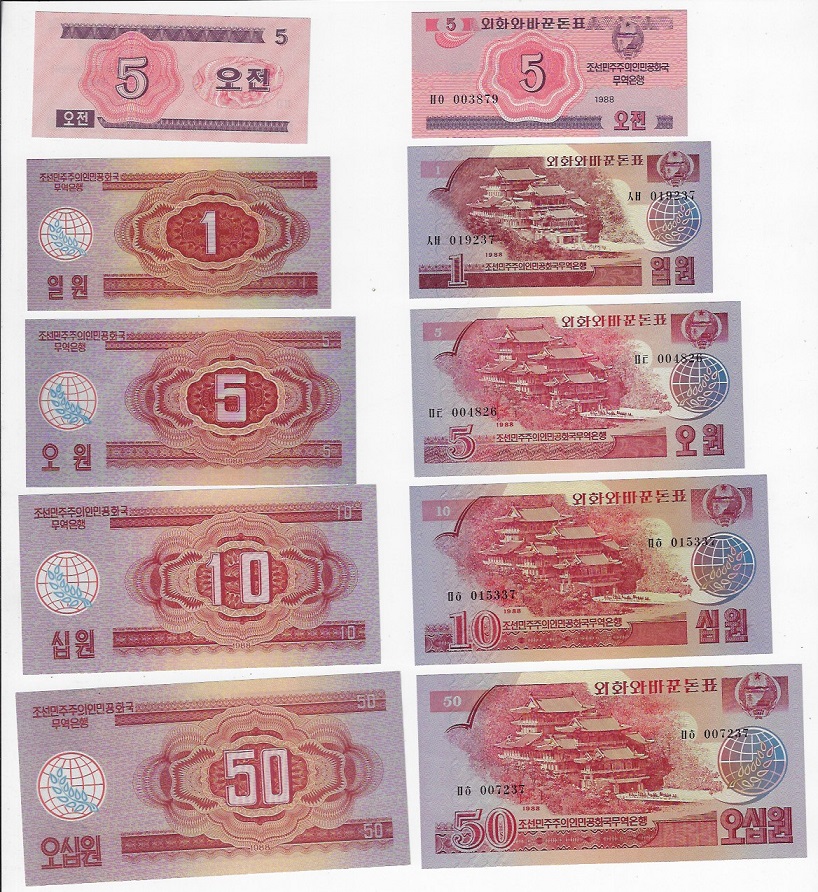 | 57375 | Coréia do Norte, 5 Chon, 1, 5, 10 e 50 Won, 1988, cédulas para visitante socialista, Pick-32 e 35/38, FE (catálogo US$92,75) | 371,00 | Foto |
