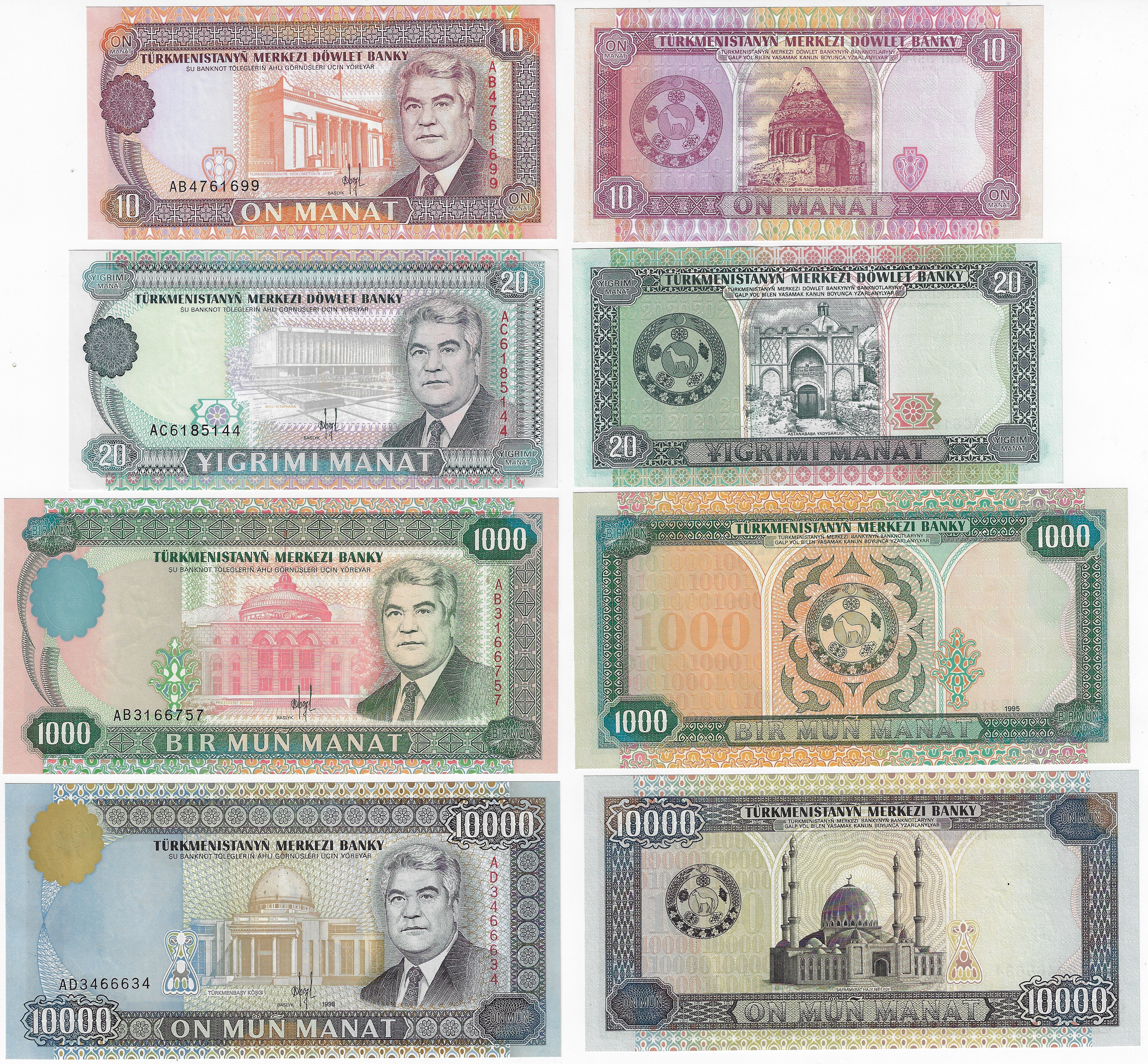 | 57675 | Turcomenistão, 10, 20, 1.000 e 10.000 Manat, 1993/1998, Pick-3, 4a, 8 e 11, FE (catálogo US$36) | 65,00 | Foto |